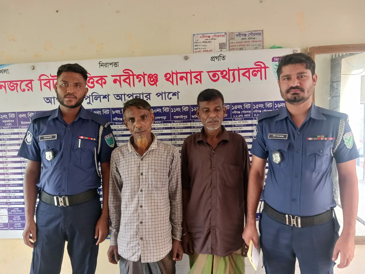 গ্রেপ্তারকৃতরা হলেন— পৌর এলাকার পিরোজপুর গ্রামের কবির মিয়ার ছেলে মো. শরীফ উদ্দিন (৫৫) এবং রাজাবাদ গ্রামের মৃত আনোয়ার আলীর ছেলে মাসুক মিয়া (৫২)। তাদের কাছ থেকে মোট ৩২ পিস ইয়াবা উদ্ধার করা হয়।