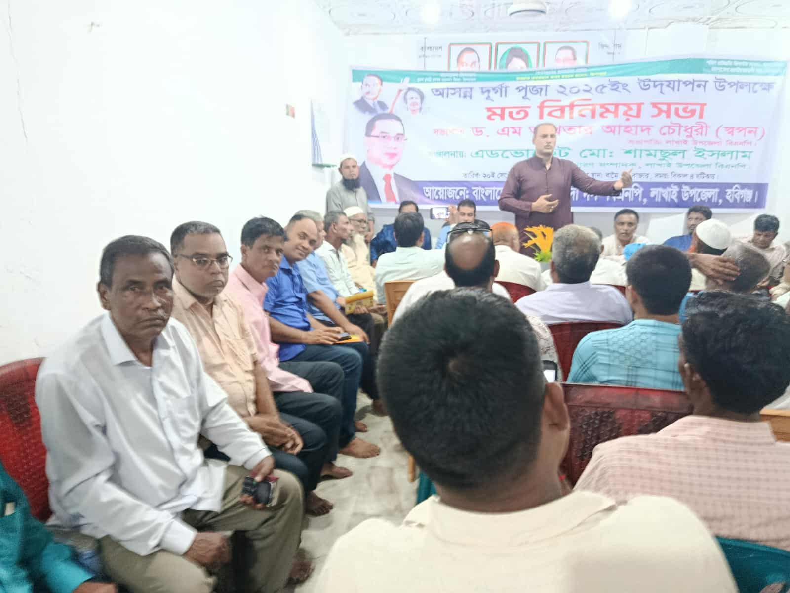 আসন্ন শারদীয় দুর্গাপূজা শান্তিপূর্ণ ও সুষ্ঠুভাবে সম্পন্ন করার লক্ষ্যে হবিগঞ্জের লাখাই উপজেলায় এক মতবিনিময় সভা অনুষ্ঠিত হয়েছে। শনিবার (২০ সেপ্টেম্বর) বিকেলে উপজেলা বিএনপি কার্যালয়ে এ সভার আয়োজন করা হয়।